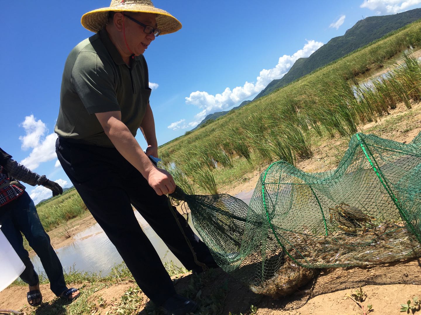 在我校陈日胜教授负责的渔稻共作海水稻示范种植基地现场,调研组领导和专家仔细查看了海水稻耐盐筛选场地和沿海堤坝与海水流灌情况。在一望无际的海水稻-虾、蟹种养结合试种养基地,当看到海水稻长势良好,虾、蟹丰收,大家兴致盎然,领导专家们一边认真听取陈日胜教授就海水稻种质资源、品种品系选育、示范种植和渔稻共作情况的汇报,一边进行详细探讨,并就海水稻试种与研究数据积累和整理提出意见和建议。