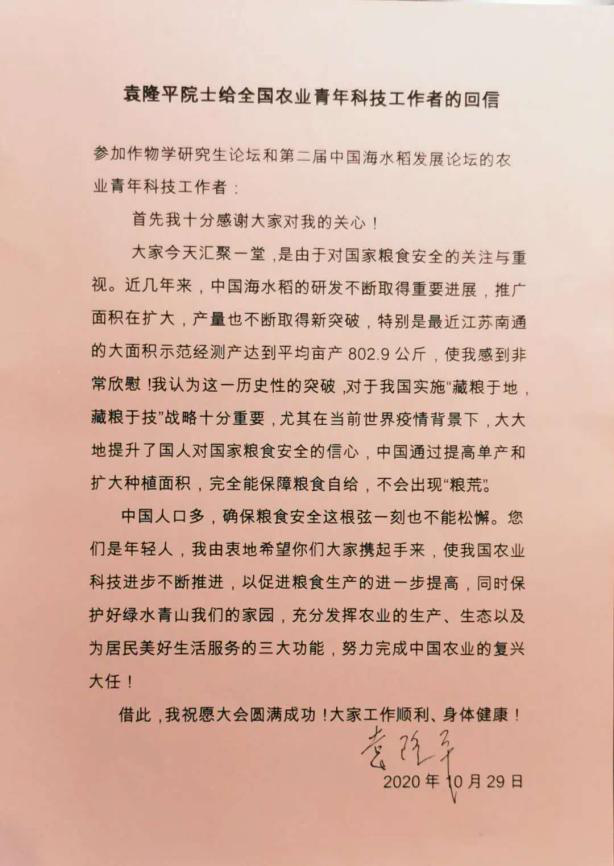 在10月29日论坛的开幕式中,中国工程院院士、杂交水稻之父袁隆平给全国农业青年科技工作者的回信中表示,希望大家携起手来,使我国农业科技进步不断推进,以促进粮食生产的进一步提高,同时保护好绿水青山的家园,充分发挥农业的生产、生态以及为居民美好生活服务的三大功能,努力完成中国农业的复兴大任!