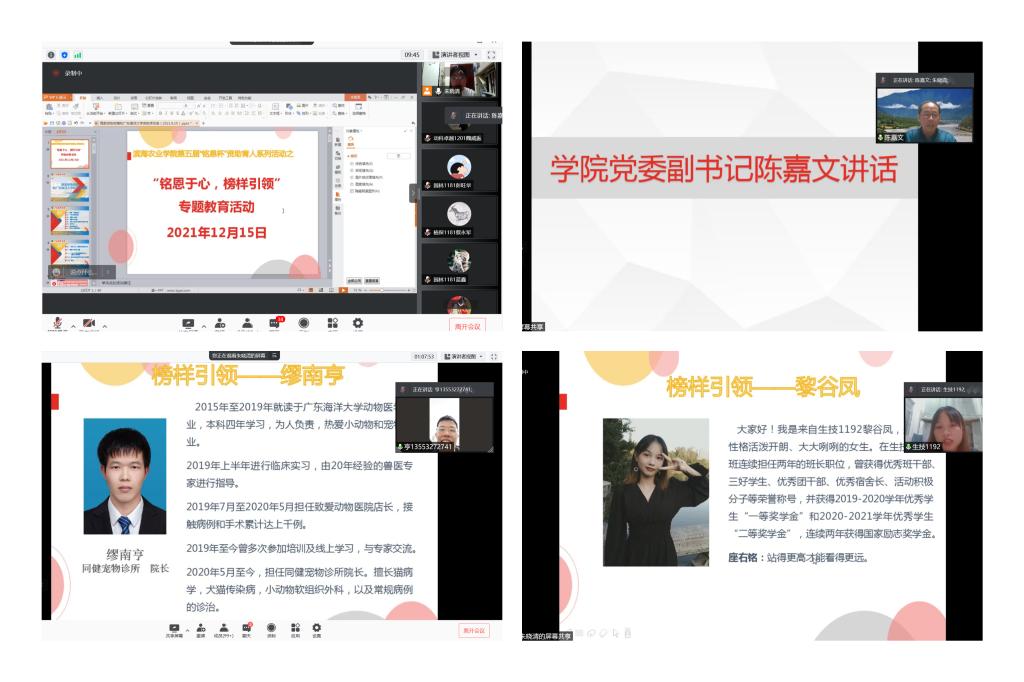 “铭恩于心、榜样引领”专题教育活动于12月15日晚通过腾讯会议举行,学院党委副书记陈嘉文、各系辅导员以及学院全体受资助同学参加。活动第一部分是由辅导员朱晓清讲解国家资助政策和williamhill英国中文奖助学体系,介绍学院2021年度奖助学情况,强调了学校学院跟随国家角度,不让学生因为家庭困难而辍学,希望受资助同学能感党恩、跟党走、正青春、共奋进。活动第二部分邀请了学院自立自强典型人物生技1192黎谷凤同学和2019届毕业校友缪南亨介绍了自己奋进的心路历程,激励受资助同学积极进取、努力学习,实现自己的人生理想。随后陈嘉文从自身成长经历告诉同学们只有国家的强大才有个人更好地发展,他也希望受资助同学能从多元资助体系中成长成才,把自己的个人理想和国家前途命运结合在一起,学好专业知识为乡村振兴战略贡献自己的一份力量。最后学院向全体受资助同学发出做“资助政策的学习者、传播者和知恩感恩的践行者”的倡议书。