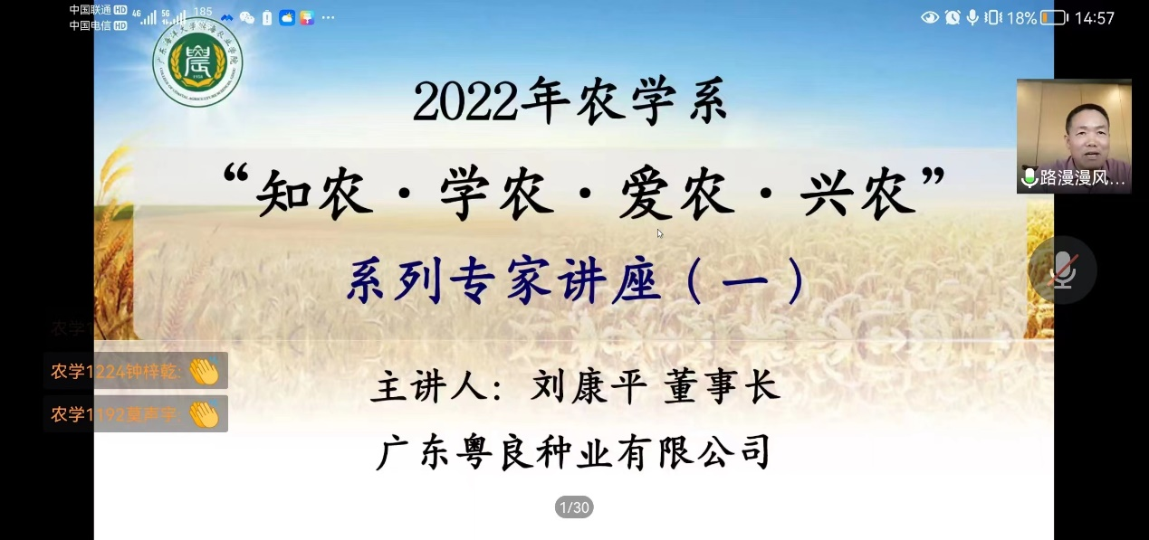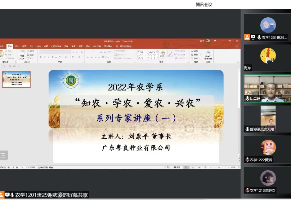 2022年9月14日下午,应我院农学系邀请,广东粤良种业有限公司刘康平董事长通过网络会议的形式,开展关于“知农·学农·爱农·兴农”系列讲座。讲座由系主任沈雪峰副教授主持,辅导员、班主任和2019、2020、2021和2022级农学专业两百多名学生聆听讲座。