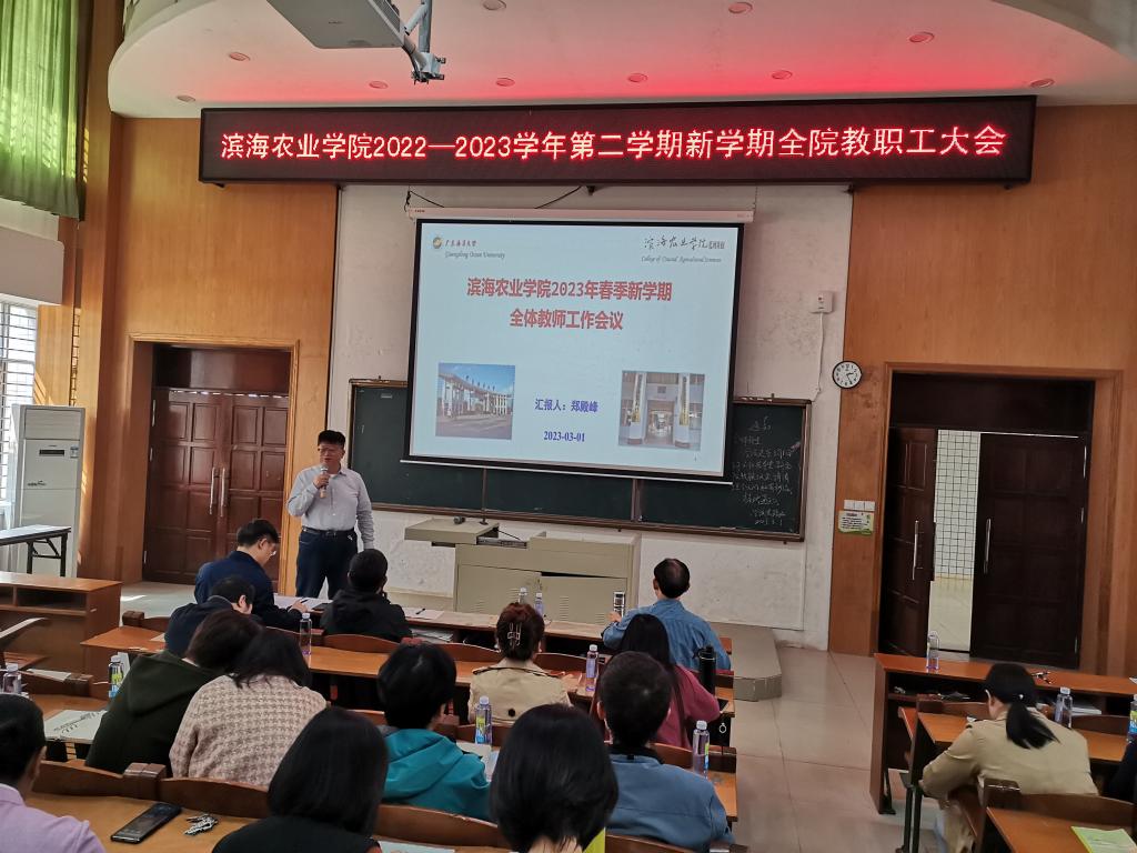 郑殿峰院长传达了学校2023年新学期工作会议精神,解读了学校2023年重点工作。并从9个方面介绍学院2023年重点工作:一是全力做好新农科实习实践创新基地的谋划与建设;二是推进申博、申硕准备工作;三是推进国家耐盐碱水稻技术创新中心华南中心建设;四是加强学科建设;五是加强国家级、省级一流专业建设;六是打造科研团队,推进科研与服务乡村振兴;七是继续优化学院专业设置;八是继续强化对青年教师的的培养;九是加强党的建设,做好安全工作。要求全院教职工落实好学校、学院的重点工作部署,全力推进学院高质量发展,在高水平海洋大学建设的新征程上取得新突破、开创新局面。