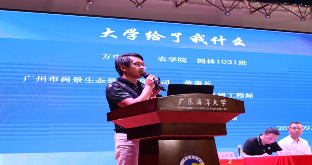 校友代表——广州市尚景生态景观有限公司董事长、我校研究生导师方中健校友以“大学给了我什么”为题,与师弟师妹们分享了他学习经历、创业经历、取得的成绩荣誉等的深刻感悟,希望师弟师妹们沉下心来,学会学习、学会做人、学会做事,以校为荣、以校为傲,积极提升自我、发展自我,为学校争荣誉,国家建设发展做贡献。