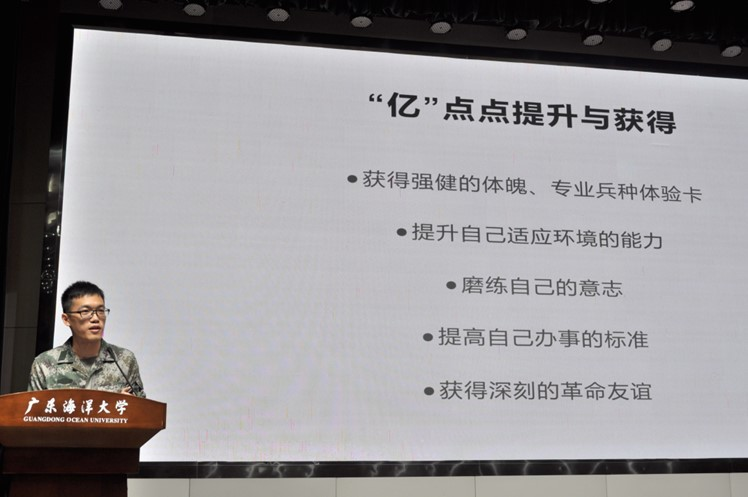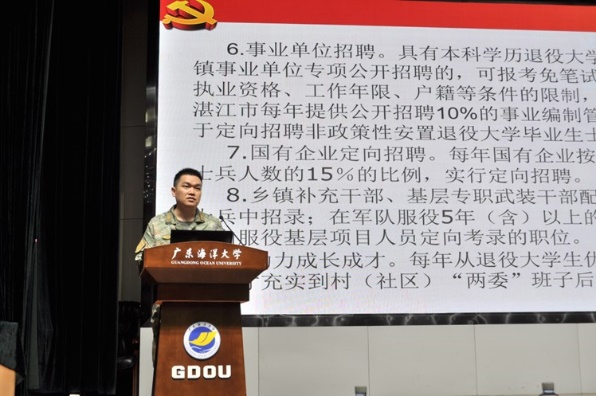 随后,麻章区人民武装部干事余华臣从大学生征兵的优势、应征入伍条件、职业发展、优抚优待、就业升学等重点内容为大学生进行了全面详细的征兵政策解读。现役学子周淑缓、退役学子黎永乐和徐钰用自身经历、生动的事例和感人的故事展示了军人的荣耀和责任,让现场的农青学子们更加立体地了解部队生活,看到了军人的职业发展前景,引发了现场观众的强烈共鸣。