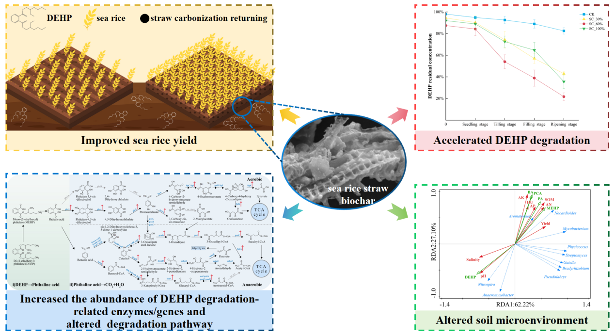 邻苯二甲酸二(2-乙基己基)酯是一种广泛分布于环境中的持久性有机污染物,对人类健康构成重大威胁。然而,关于滨海盐碱土中邻苯二甲酸二(2-乙基己基)酯的风险和修复的研究很少。在研究过程中,李慧君等人发现秸秆炭化还田策略可以通过增强对有机污染物的吸附能力来降低其在土壤中的生物可利用性和毒性。此外,秸秆炭化还田可以减轻盐胁迫,增加海水稻生长所需的养分和微量元素,从而提高海水稻产量。同时,秸秆炭化还田条件下加速了邻苯二甲酸二(2-乙基己基)酯的降解,这主要是由于土壤pH值和有机质含量的增加,Nocardioides、Mycobacterium和Bradyrhizobium等邻苯二甲酸二(2-乙基己基)酯的潜在降解菌富集所致。一些与降解相关的关键基因(酯酶和细胞色素P450)和邻苯二甲酸二(2-乙基己基)酯降解相关的关键基因(pht4、pht5、pcaG、dmpB、catA和fadA)的升高,也解释了秸秆炭化还田过程中邻苯二甲酸二(2-乙基己基)酯的加速降解,同时邻苯二甲酸二(2-乙基己基)酯的降解路径从苯甲酸途径转向原儿茶酸途径。海水稻种植兼具改善生态环境和发展社会经济的双重作用。