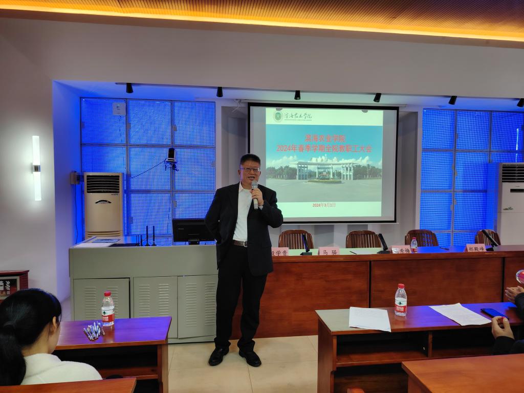 院长马驿部署了2024年学院重点工作,一是加强党的建设,发挥党组织作用,凝聚力量,为学院发展提供政治保证;二是做好本科教育教学审核评估整改工作;三是持续加强专业建设;四是加强教研室和课程组建设;五是进一步提升学科发展水平;六是加强科研团队建设,做好社会服务工作;七是加强国家耐盐碱水稻技术创新中心华南中心建设,完成验收工作;八是推进新农科实习实训基地建设;九是继续加强青年教师培养力度;十是加强学生管理服务工作,做好创新创业与就业工作。