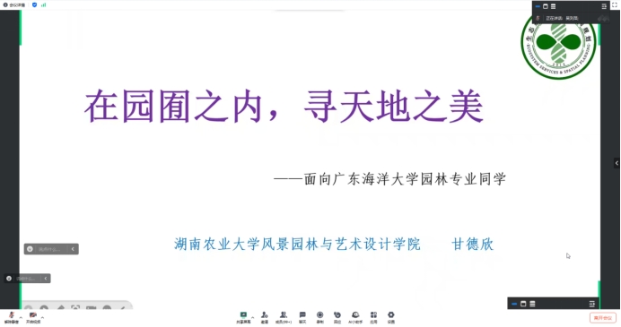2024年7月3日晚,湖南农业大学风景园林与艺术设计学院甘德欣教授应williamhill英国园林系邀请,做客园林大讲堂,通过线上形式作了题为“在园囿之内,寻天地之美”的主题讲座。园林系师生共计约250人参加讲座,讲座由园林系主任吴刘萍教授主持。