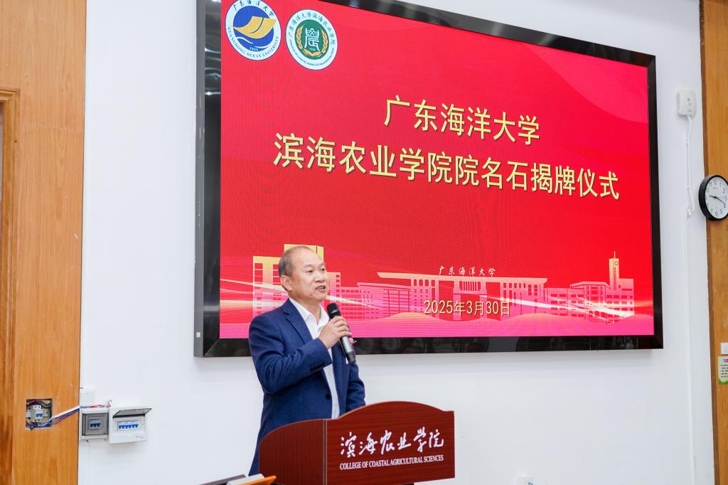 邓逢光副校长代表学校致辞,邓校长说,学院扎根粤西、服务“三农”,在新农科建设、滨海农业研究、服务乡村振兴等领域成效显著。培养的一代代学子,以赤子之心践行“强农兴农”的使命担当,为学校赢得了广泛赞誉。校园文化景观作为大学文化的直接表达,承载着彰显文化自信,传承大学之道,培育核心价值的文化使命。将“美丽校园”从物质的“绿化、美化”层面提升到精神的“文化、教化”层面,发挥了“美丽校园”的境教育人功能。这座院名石仿佛在告诉每一位海大人:如同大鱼般在知识的海洋中不断探索、奋发向前,以跃动的力量书写属于自己的精彩篇章。院名石不仅是学院的精神象征,更是校友心系母校的赤诚见证,希望广大校友继续与母校同心同行,持续关心和支持学院的发展;希望学院以此次揭牌为契机,继续深化内涵发展,为学校建设和人才培养作出更大贡献。