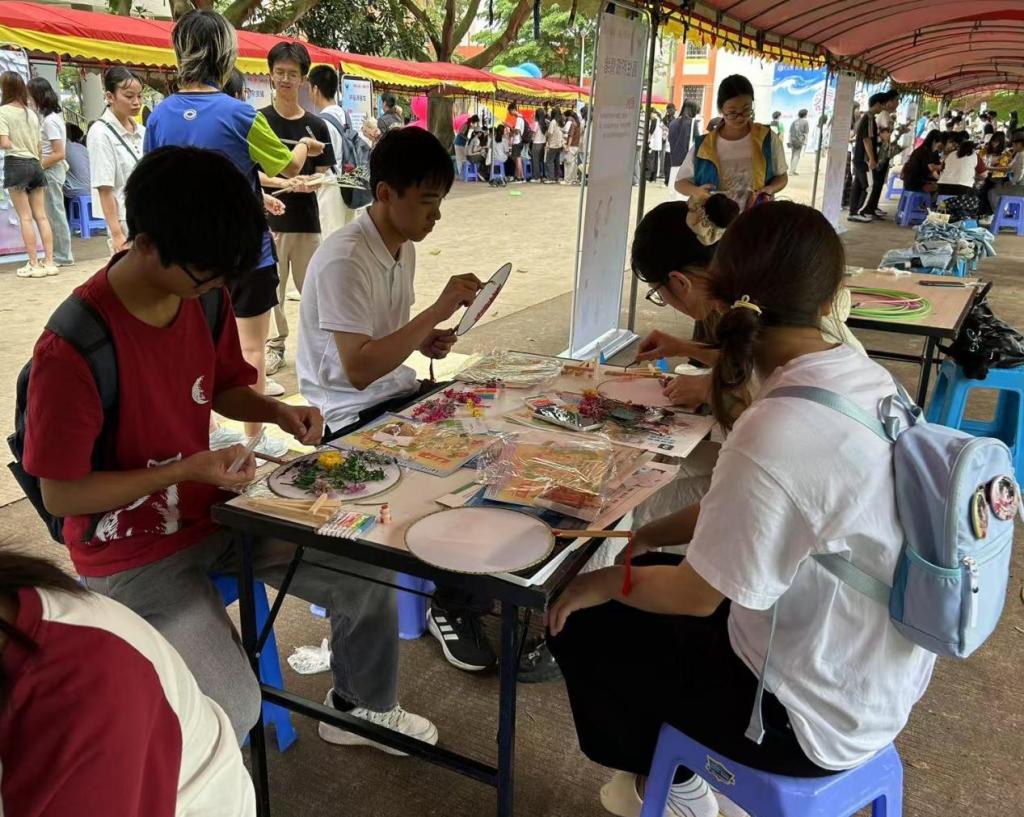 自由插花:在减法中遇见本真。插花体验区以“不完美美学”为核心理念,非洲菊、康乃馨、尤加利叶等花材供参与者随心搭配。没有固定模板,只需根据内心感受调整花枝的高低与疏密。“修剪多余枝叶就像丢掉烦恼,剩下的都是纯粹的美好。”一位学生捧着自己的作品笑道。盲盒花材挑战环节更是巧妙融入心理教育,引导大家接纳意外之美,领悟“减法生活”的哲学。