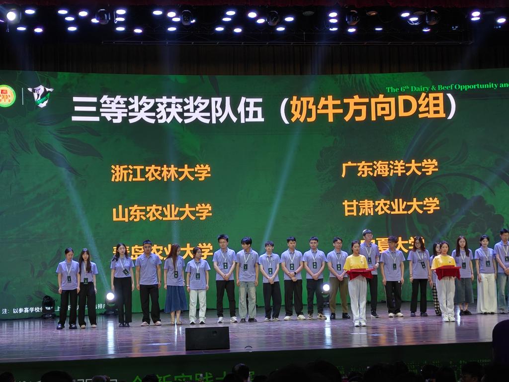 聚焦奶牛和肉牛养殖领域的理论与实践操作,设置了丰富的竞赛环节。通过理论考核、实操评估与现场答辩三大模块,全面考察参赛选手从养殖基础到管理决策的全流程综合能力。我院肉牛队(李涛、郑隆清、廖洁、苏梦容;指导教师:马健、尹福泉)和奶牛队(周焱龙、区钊明、劳蔼鸿、陈冠宜;指导教师:杜春梅、于海滨)分别荣获全国二等奖和三等奖。