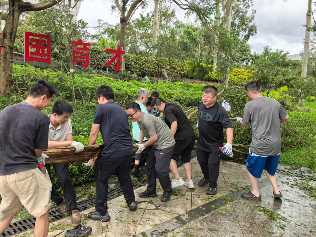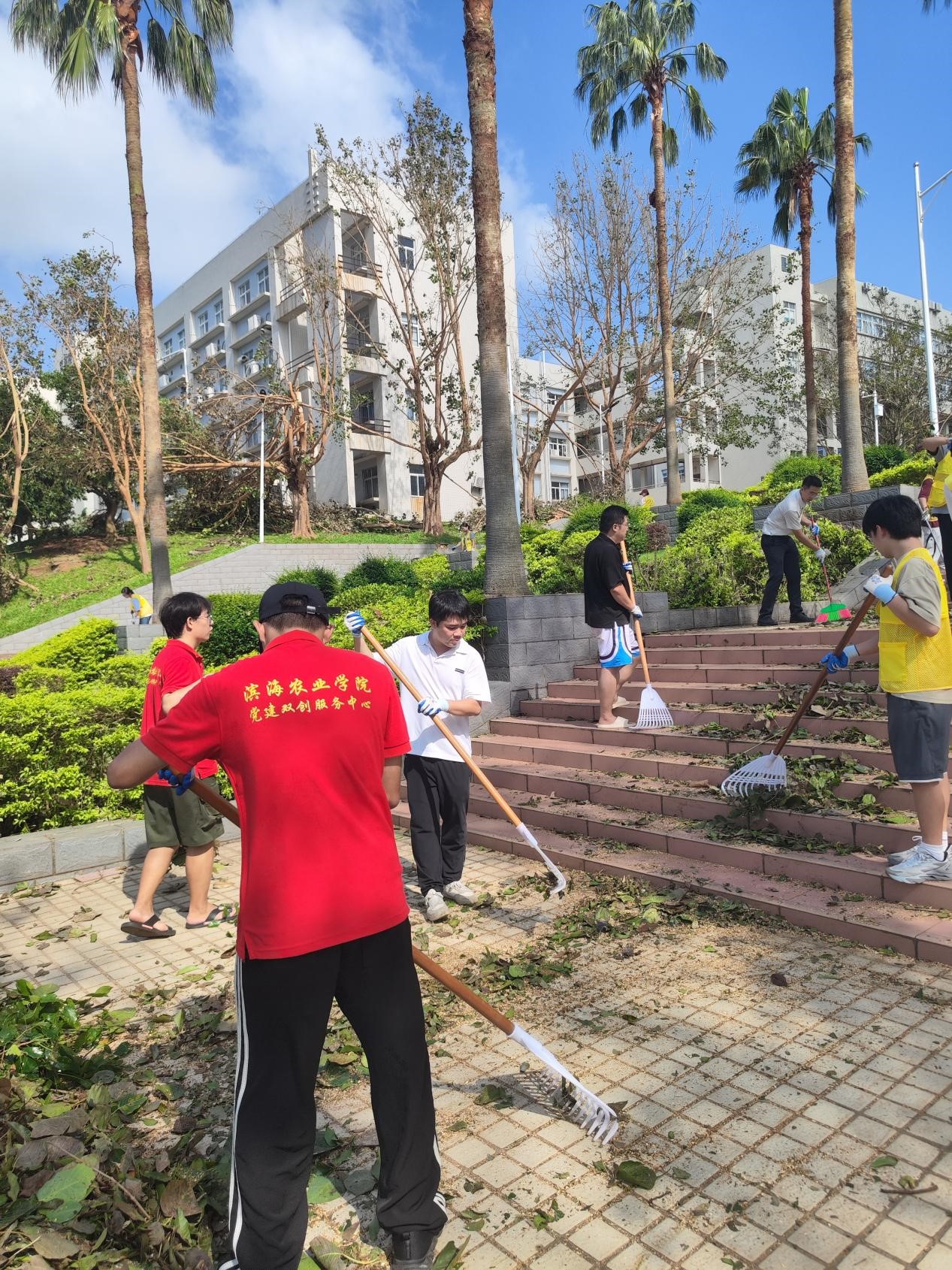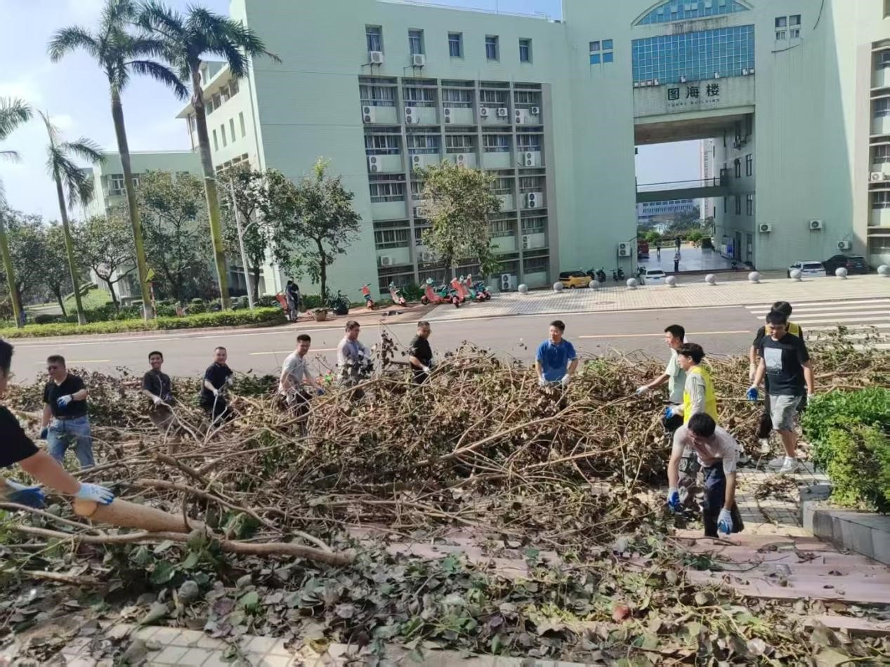 10月5日,第21号台风 “麦德姆” 在湛江市徐闻县东部沿海登陆,湖光校区的校园环境和基础设施遭受严重破坏,校园内树木倒伏、断枝遍地、道路受阻,满目疮痍。6日,学院党委组织党员先锋队第一时间投入到灾后清理重建工作中,重点负责清理兴农楼周围和附近主干道倒伏树木,打通校园师生生活、工作通道。8日,国庆、中秋假期最后一天,为尽快消除近期台风过境对校园环境造成的影响,有效防范公共卫生风险,保障师生身体健康,确保复学复课工作平稳有序。学院党委积极响应关于台风灾后校园重建与卫生防疫工作的指示要求,组织师生开展“救灾复学,净化校园”爱国卫生运动。