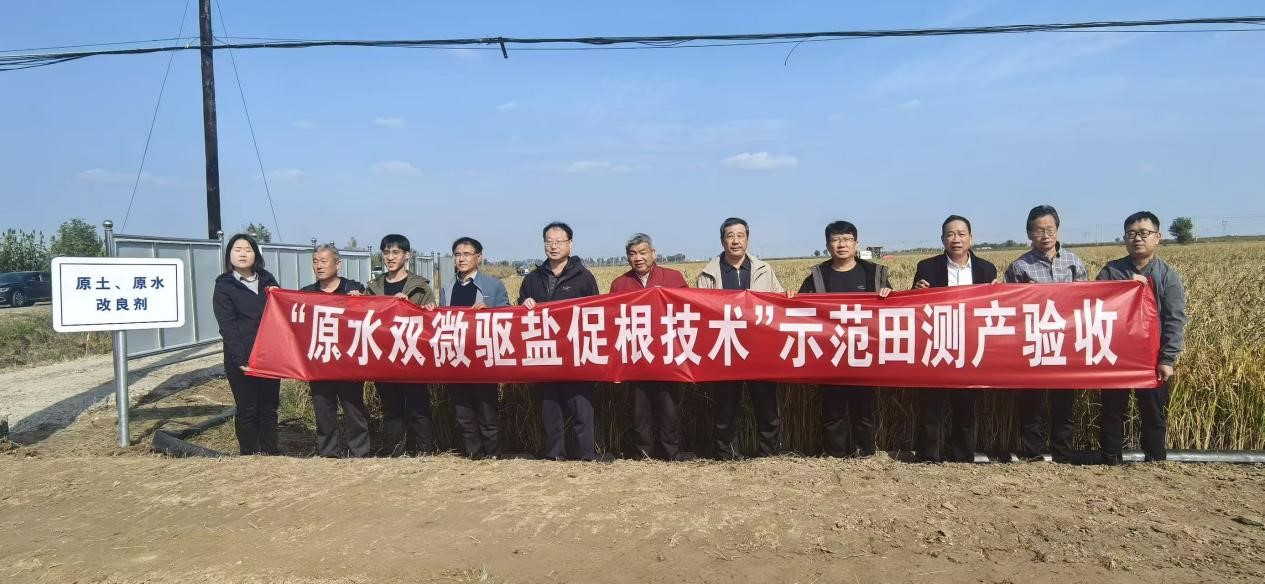 山东省作物学会组织中国农业大学、扬州大学、山东省农业威廉希尔院等单位专家对《盐碱地综合利用与改良技术研究与示范项目》中的“盐碱地原水双微驱盐促根技术”水稻丰产方进行现场测产验收。专家组在听取项目负责人工作汇报后,实地考察了示范现场,按照农业农村部高产创建田间实打测产验收的程序规定,实地丈量、清仓查验、计量器具校正、水分测定及称重计算,丰产方实收面积1.24亩,鲜谷重678.1公斤,含水量24.6%,按标准含水量13.5%折合亩产476.68公斤。常规原水滴灌(未施土壤改良剂)对照田实收面积1.07亩,鲜谷重265.03公斤,含水量30.1%,折合亩产200.16公斤。技术田亩产较对照田增产276.52公斤,增幅达138%。