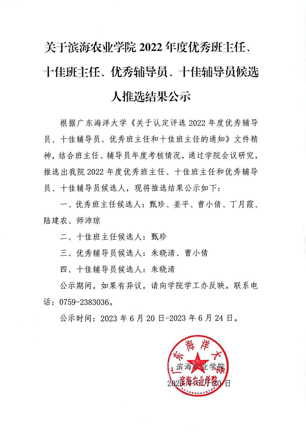 关于williamhill英国2022年度优秀班主任、十佳班主任、优秀辅导员、十佳辅导员候选人推选结果公示